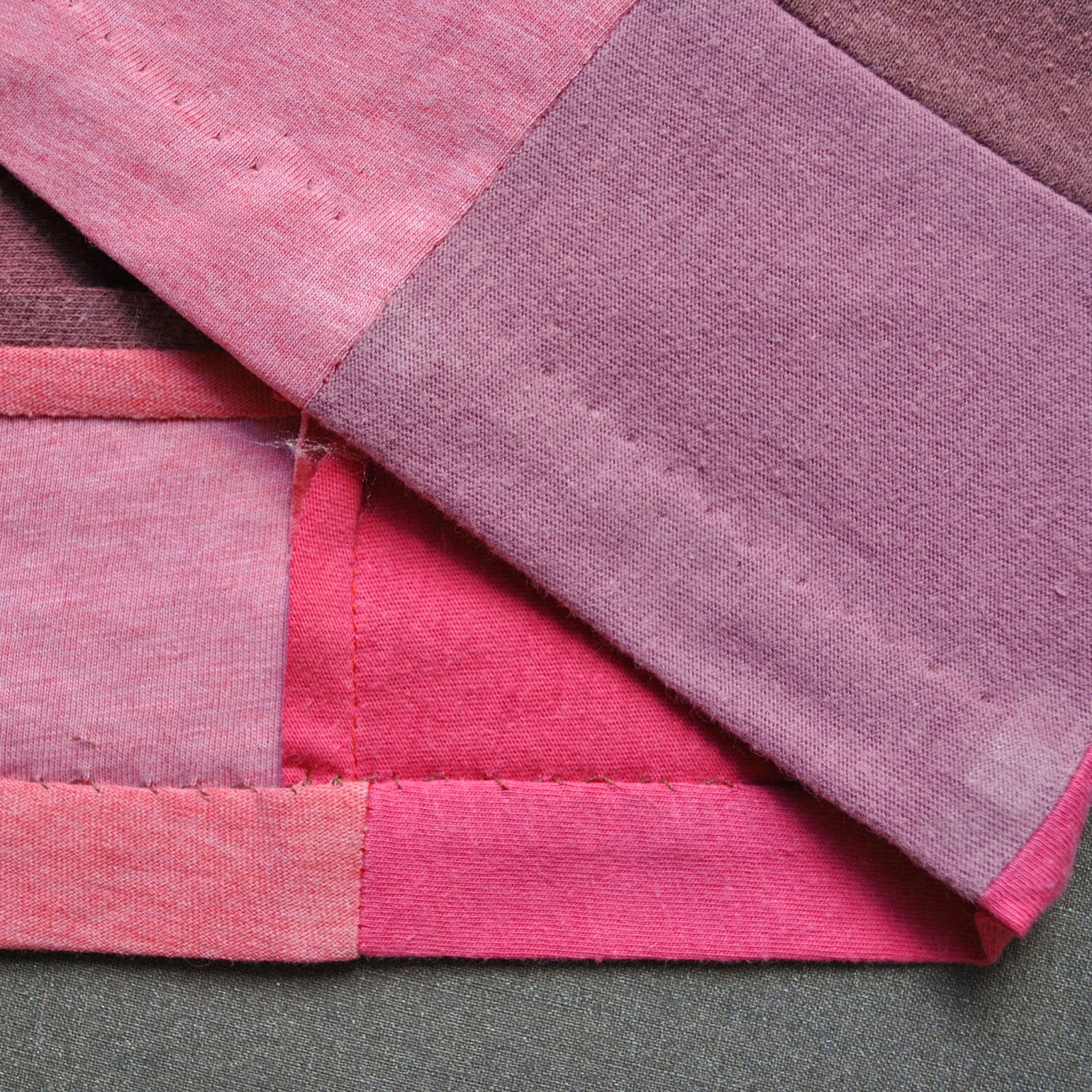 I’ve made a new top. Well, kinda new from old actually, since it’s made from 4 old Tshirts cut up and patched together. My refashioning bag yielded; a light purply-brown from Craig, two pinks from Tim, and a chocolate-y one which is one of my old self-made Tshirts. They were all old and a tad tatty here and there but still had some good bits left in them. And I liked these yummy Cherry Ripe colours together. mm-mmmmm 🙂