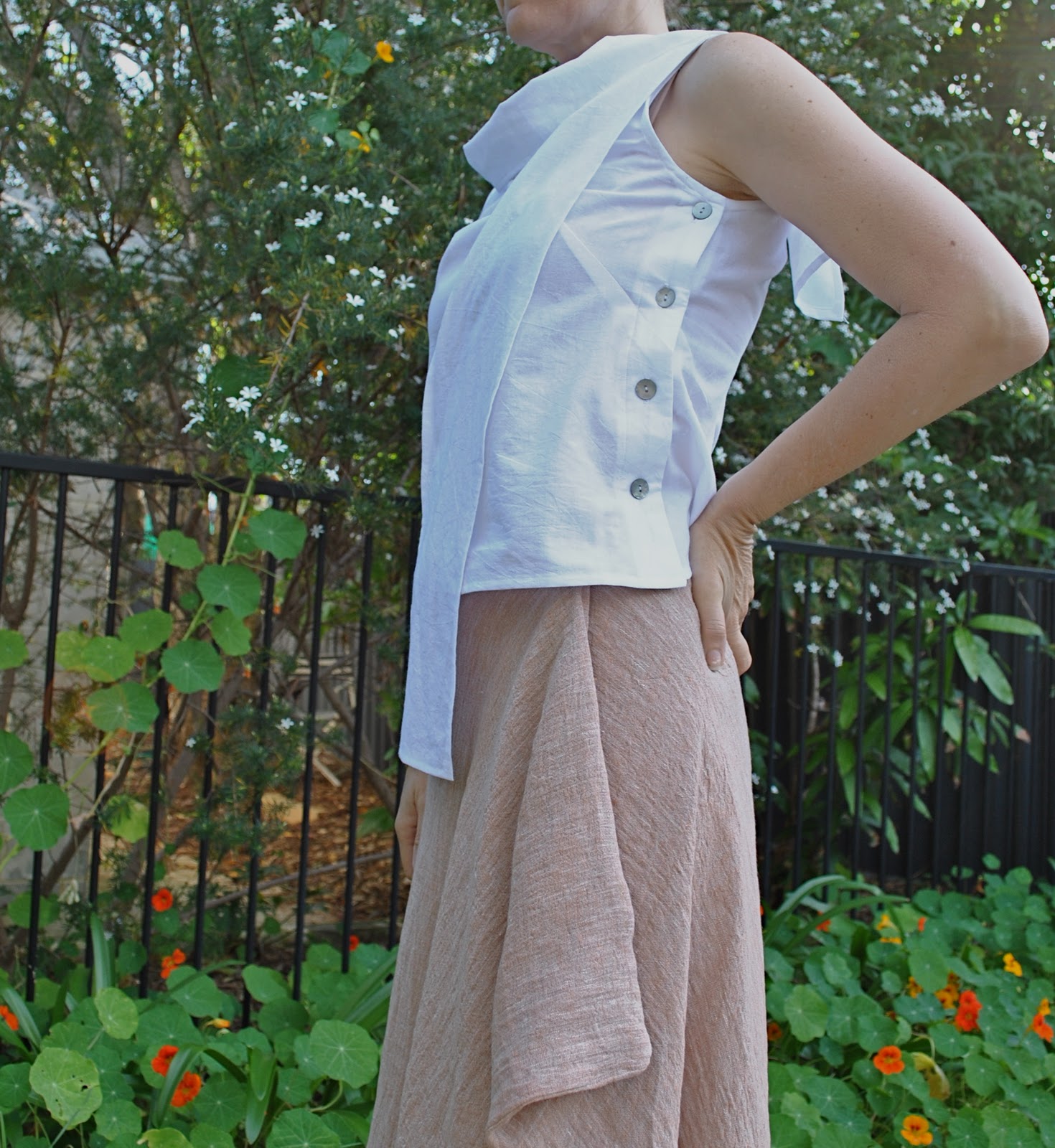 The skirt is cut in one piece, which is a strange almost tear-drop shape, with only three other pieces for the waistband, and two separate button plackets. I chose these three large nacre buttons for closure to complement the soft silver grey of the fabric. Actually I made this using the wrong side of the fabric out. The right side has a much more shimmery shiny metallic silver finish to it, but I chose the dull dove grey wrong side with a slightly felt-y texture over this as I’m not really a disco ball kind of a girl. Although come to think of it I do have some silver sequinned fabric in my stash… calling to my inner disco queen, a flashy persona buried deep within the prosaic Australian exterior… I must have bought it knowing she was down in there somewhere, hehe.
