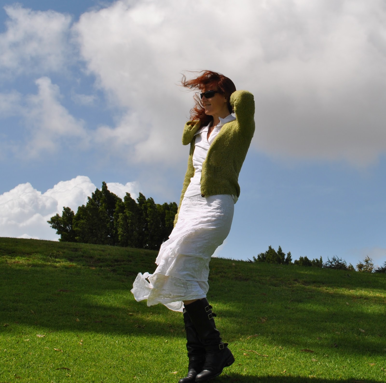 What else; an ordinary wrap front white blouse, which has proved very useful indeed and will need replacing soon. And this white lace-y skirt which I like to wear quite a lot during these transitional days as it is actually a lot warmer than it looks. It looks very light and summery but (as the saying goes); looks can be deceiving. The lining is of one of those stiffish polyester acetate fabrics that does not breath one little bit, making it a stifling choice for a summer-y day (which style-wise it looks like it should be perfect for) but actually perfect for a cooler day like today (when people often ask worriedly if I am warm enough in that summer skirt. The answer is yes actually pretty toasty, thanks. I then get the raised eyebrows and the “don’t-believe-you” look. That’s OK. I know if I’m warm enough.)