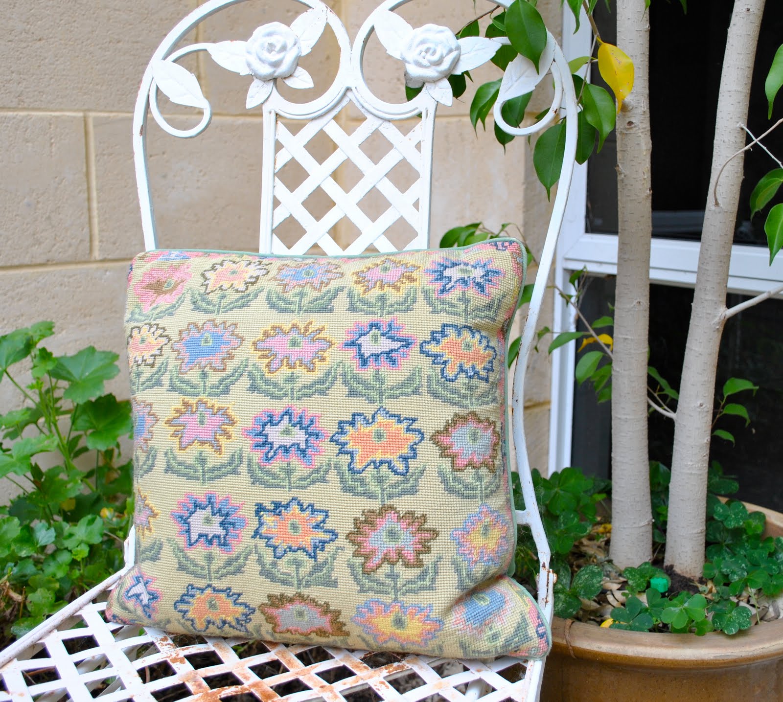 Out of all the tapestry cushions I’ve worked, this is my favourite. (well, since the others were all for the chapel and given away, to see the others click on the “tapestry” link in the “labels” below) And no, this doesn’t live on an outside chair as pictured, but in pride of position on our bed. If the house was burning down I would probably grab this cushion…