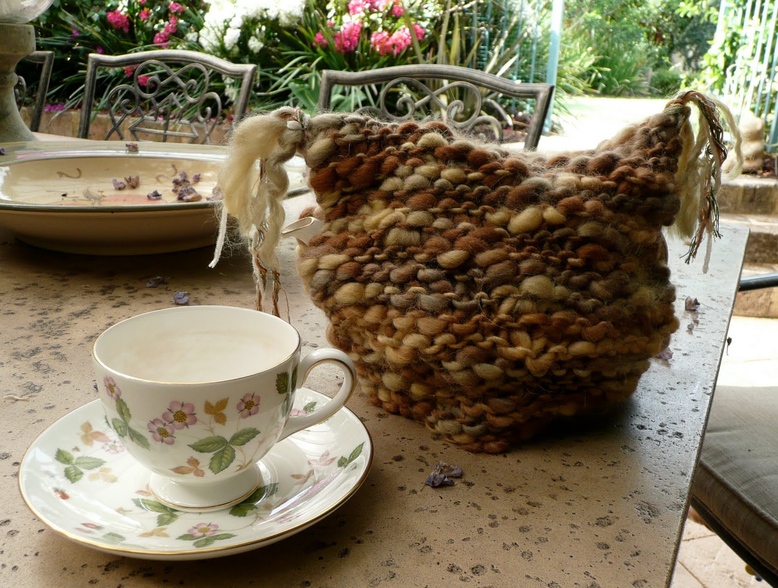 This is my version of the Chicken Little tea cosy I knitted for my friend L from “Wild Tea Cosies” by Loani Prior. I chose these colours for L because she often wears soft browns, olives and greens such as these (and looks lovely in them too), and because she is very artistic and I knew she would appreciate the lumpy rustic beauty of this tea cosy. This look is due completely to the nature of this lovely multi-coloured fleecy wool which varies from sometimes very skinny to sometimes very fat! A bit of a challenge to knit as you try to avoid getting “patches” of fat or skinny areas appearing, but are aiming for an overall even spread of thicknesses somehow. However managed this successfully and I think the outcome is rather gorgeous, if I say so myself!