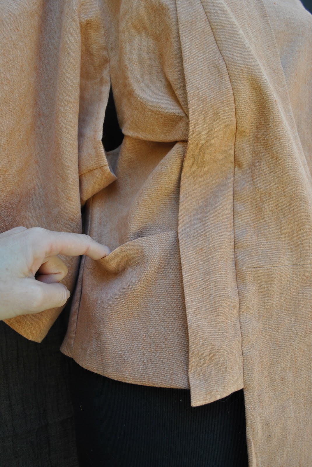 I added discreet and fairly useless little pockets, just because why not.  There is no pocket pattern piece and none are mentioned in the rather sparse reader-contributed instructions, however there are markings on the pattern not relating to anything else but that appear to indicate where a pocket could go  (dot B)  I wanted for my pockets to be as invisible as possible, so the sides disappear into the side seams and underneath the front flaps, and the lower edge is sewn flush against the lower edge of the jacket.  Meaning the only visible edge is the top edge.