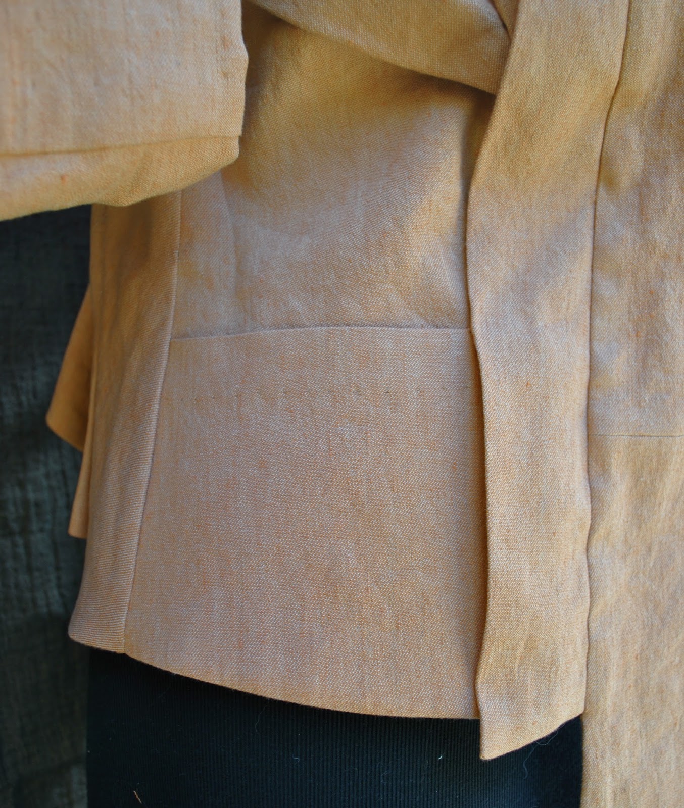 Visible hidden inside edges I finished with HongKong seaming which was then invisibly slip-stitched down to the garment.  A few invisible inside edges were finished on the overlocker.  The centre back piece was cut on the side edge and I left those raw selvedges unfinished on the inside too.  I interfaced the lower facing then later decided this made the lower edge far too stiff for my taste, so ripped it off.  There is no interfacing in the jacket now, and I like this softness.