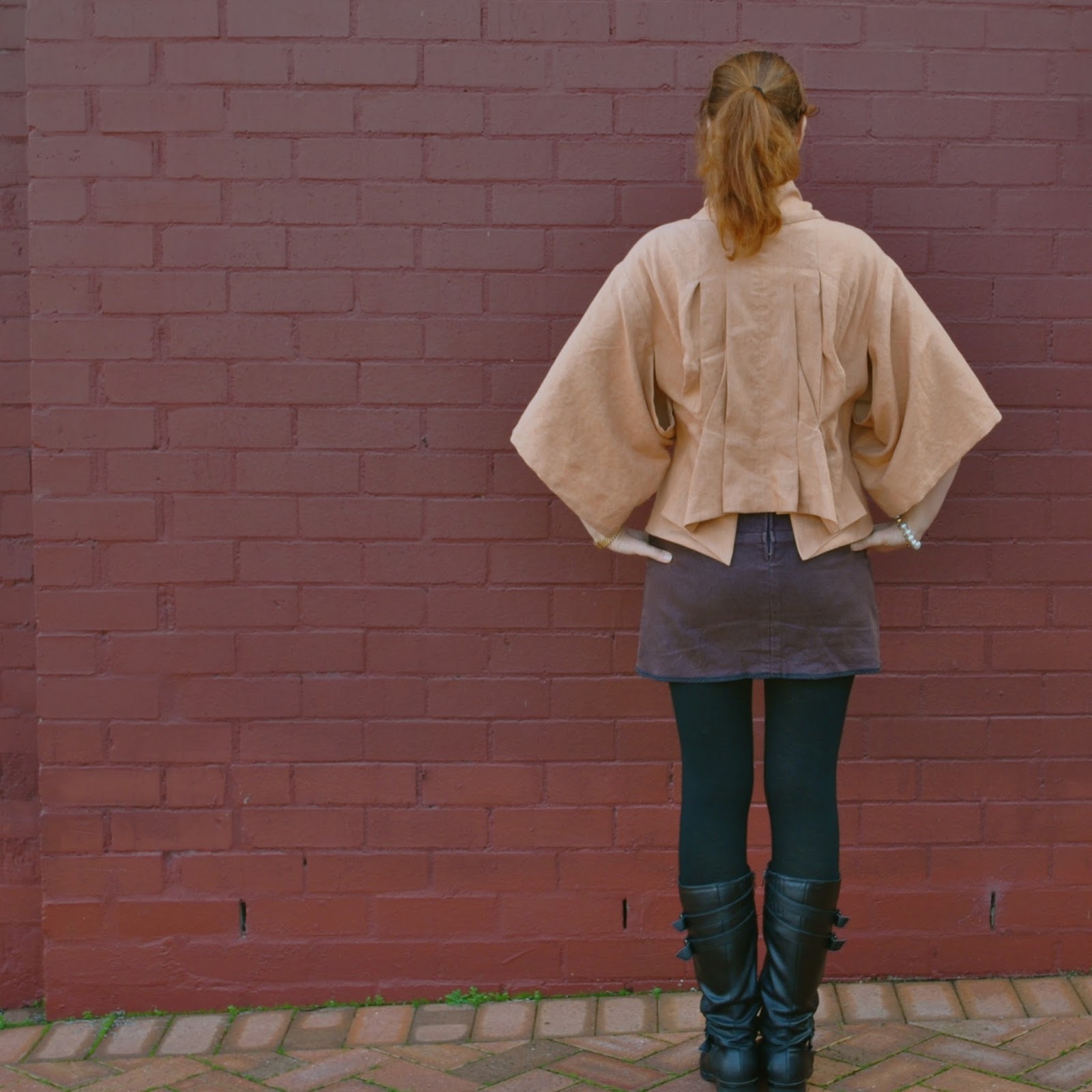 The fabric I used for this new version is a very soft cotton denim in a shade of dusky apricot, and was part of my precious Japanese-bought stash, posted here.  I just barely got the pattern pieces cut out of my 2.5m… barely! so I recommend that if you decide to make this yourself get at least 3m unless you really fancy an extra little challenge to go with this already challenging design.