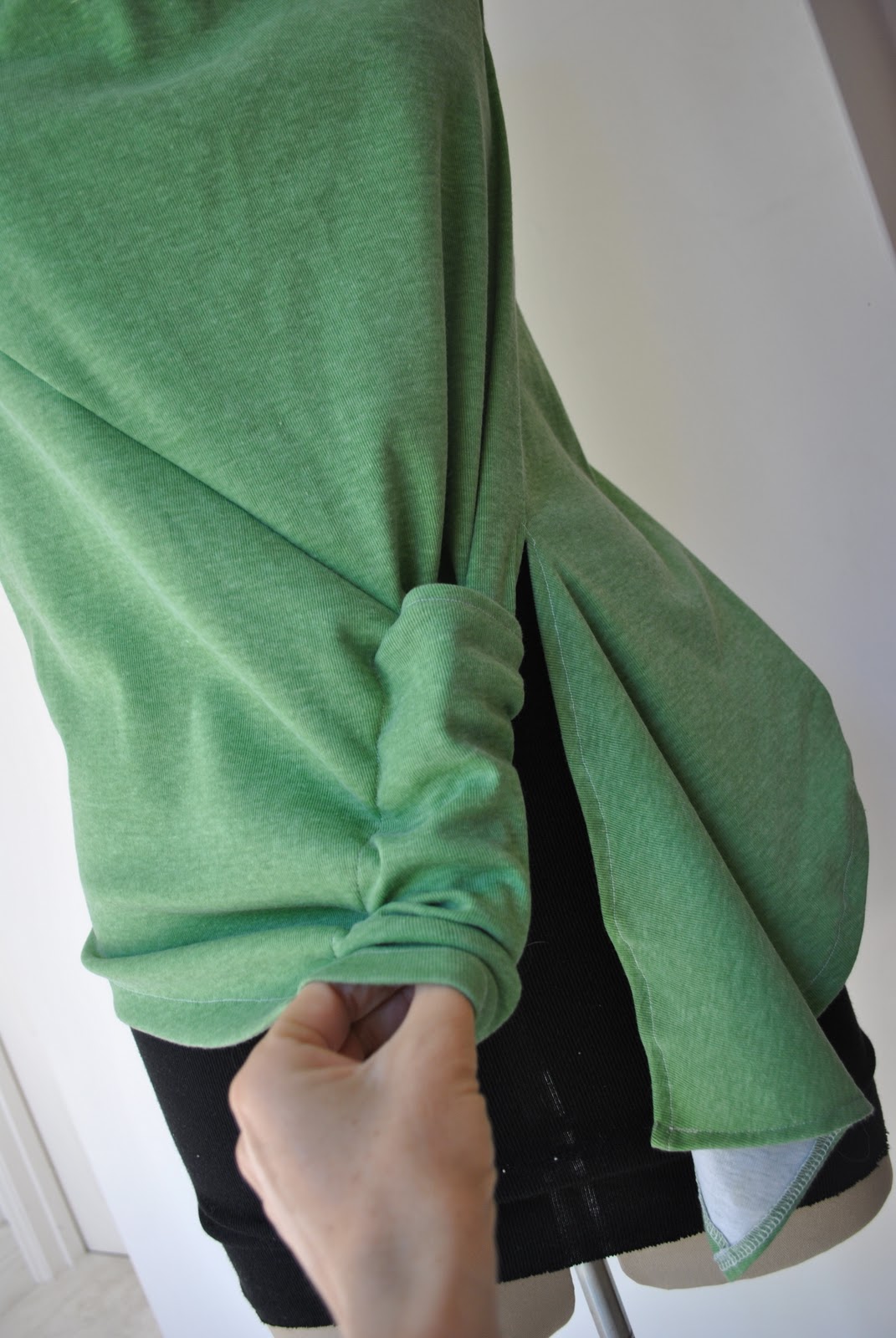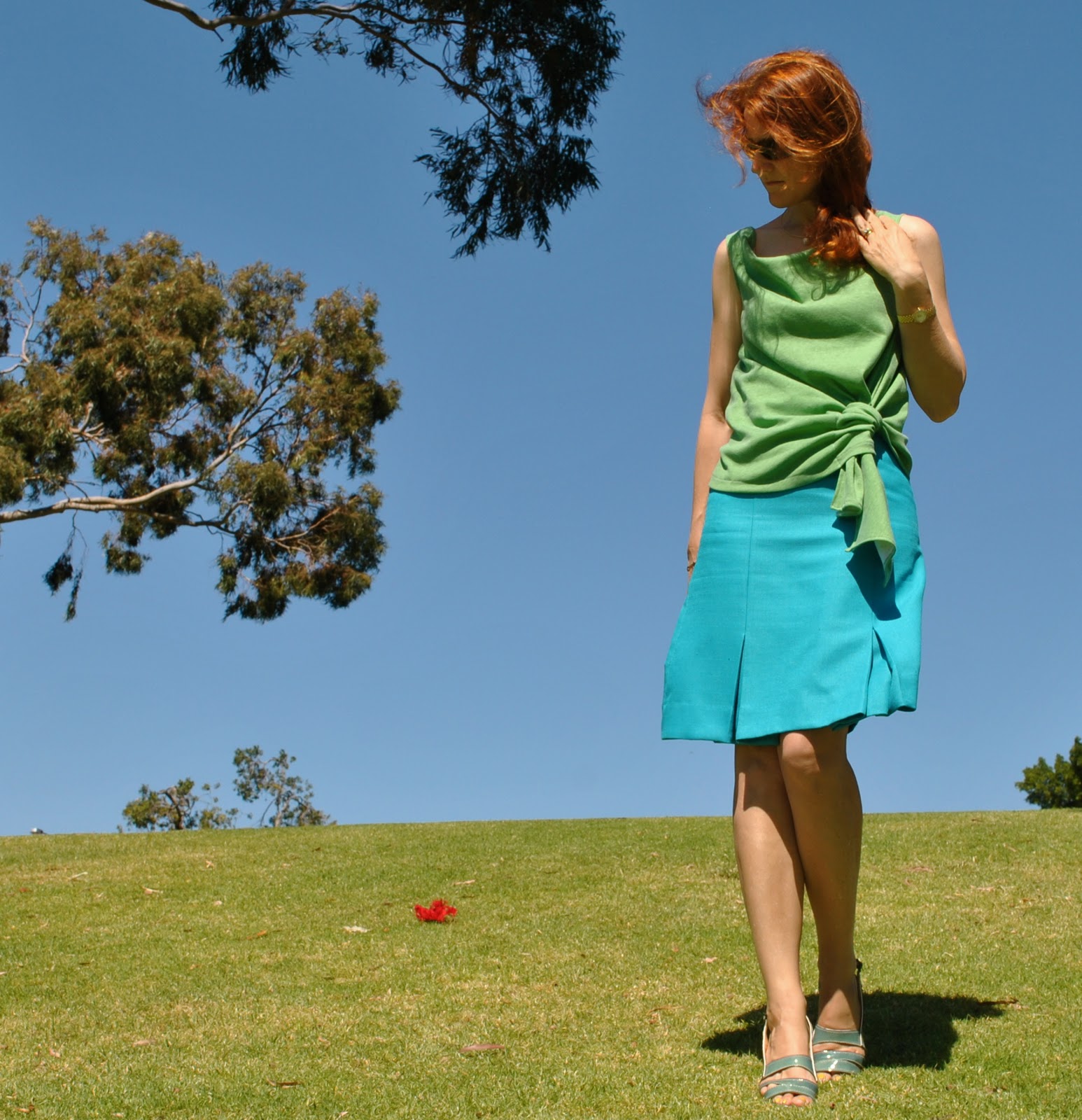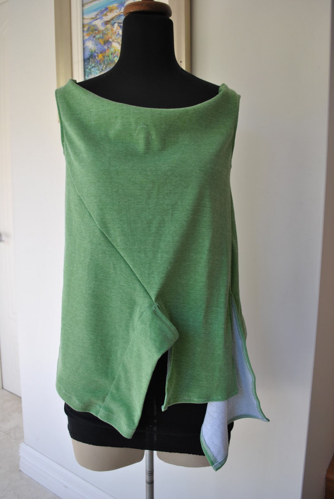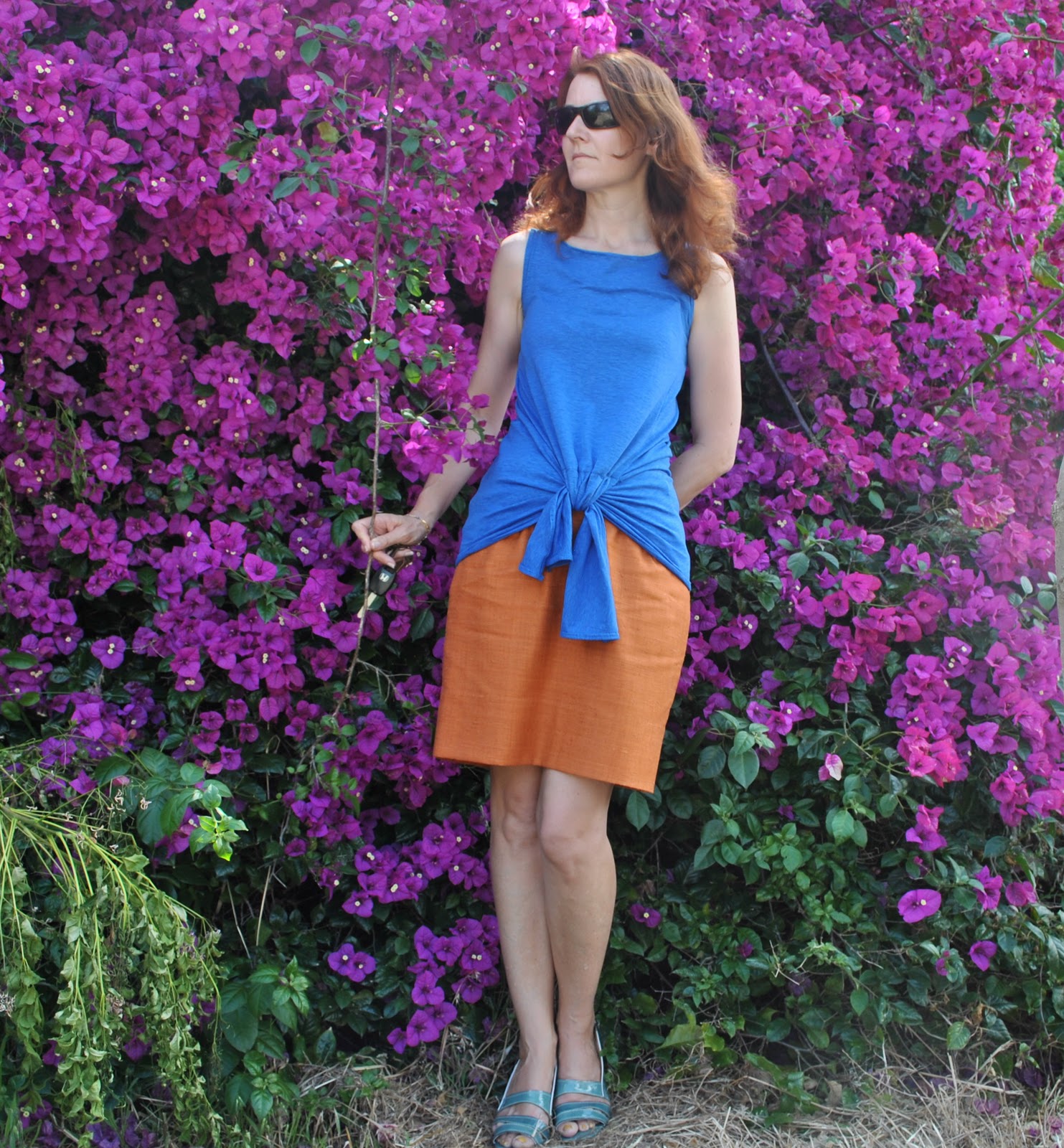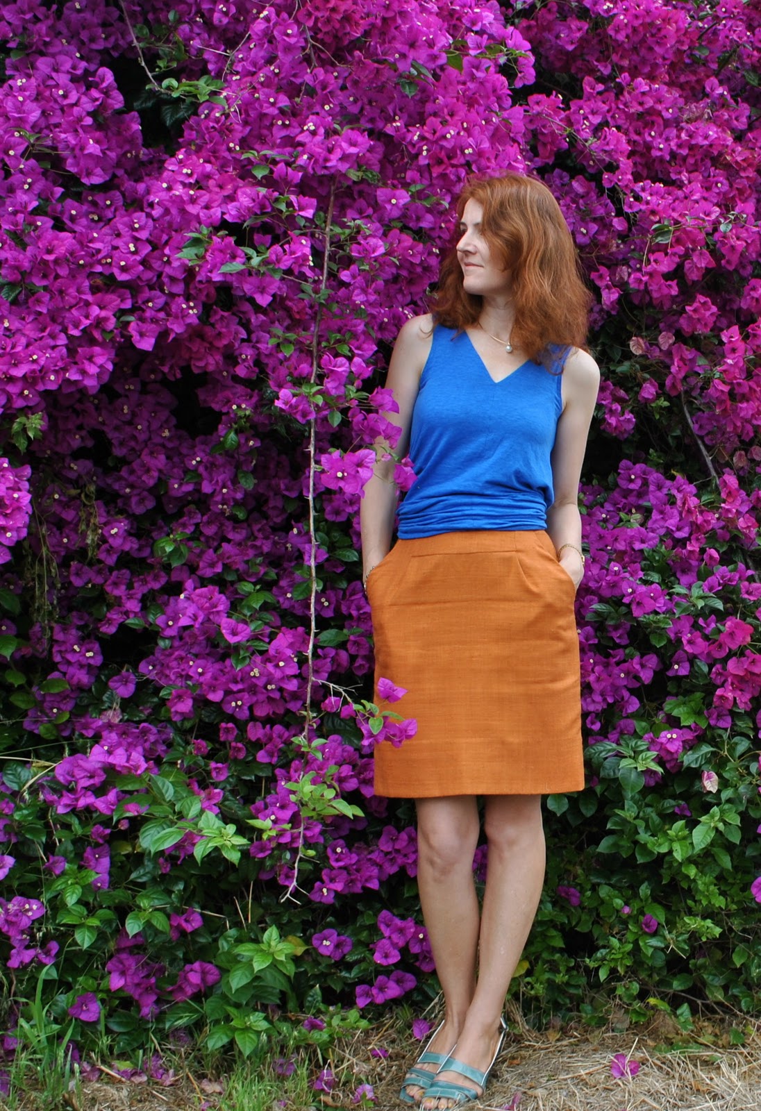 I made both the skirt and top and also my necklace here. The top was an experiment, I flipped the shoulders out in a twist to get this cowl-like effect. It used to get a lot of compliments, believe it or not! (my friends are very kind) We are sitting on one of our sofas in its first slipcover, made by me too… (now looks like this)