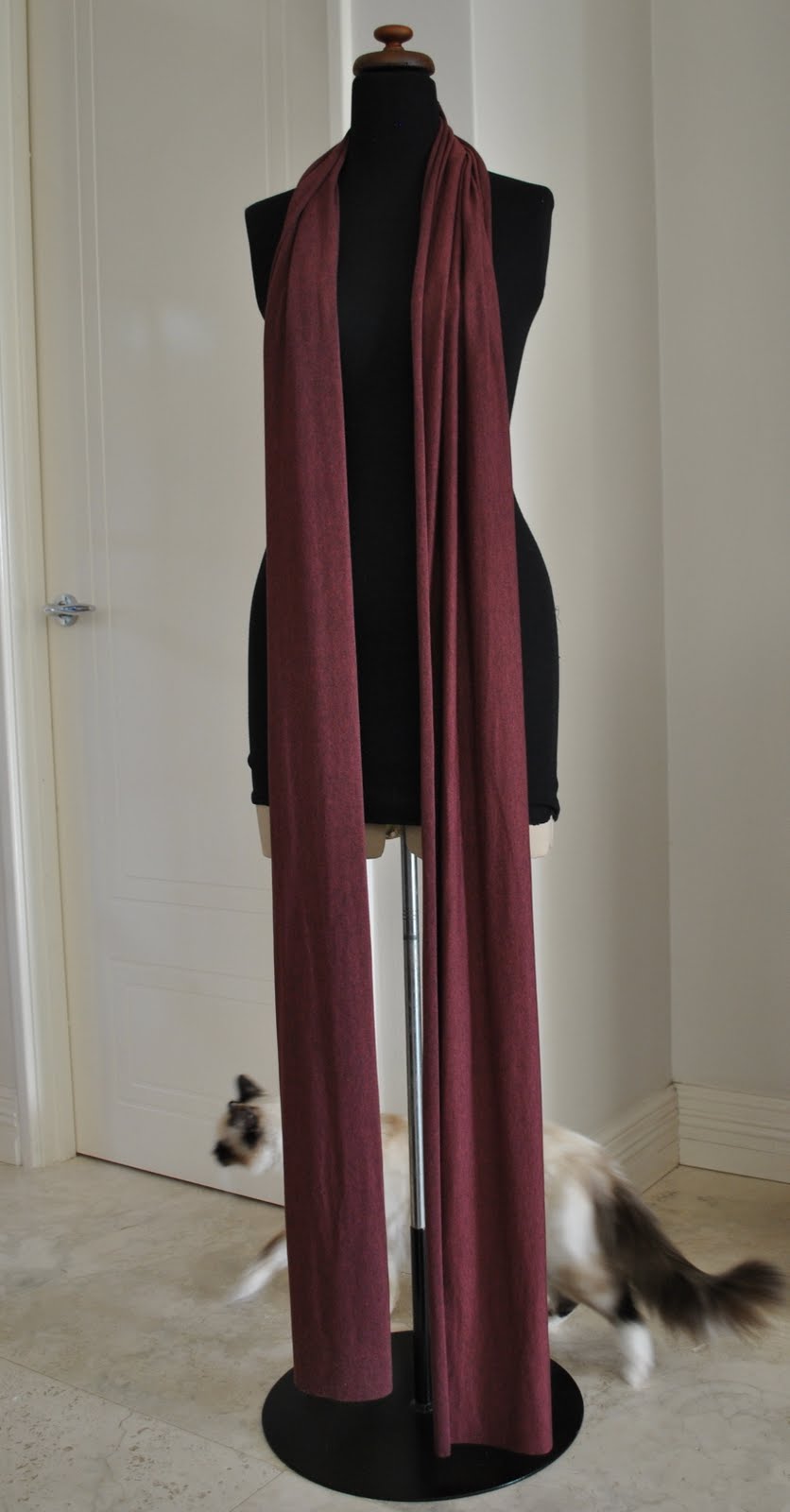 And I’ve made this new scarf too, this is just a couple of long skinny lengths of this rather luscious deep-raspberry coloured thin jersey knit that I picked up from the remnant bin, joined together in a French seam.  Voila.  Two embarrassingly short seams and one has a new scarf.  Couldn’t be easier.  Don’t you just looove this colour?