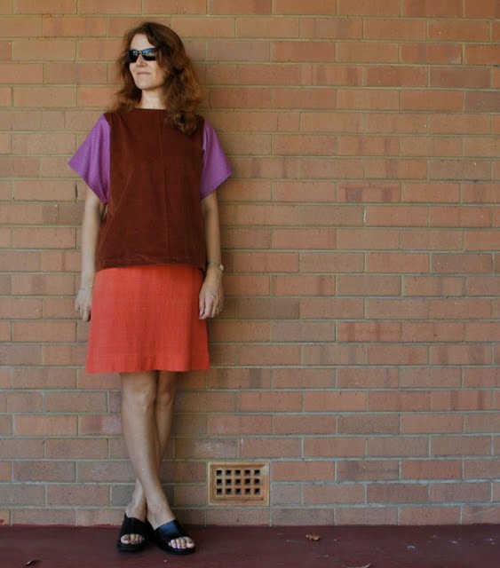 This is one of the new things I’ve made in my stash’n’scrap busting efforts; a new top. Getting rid of two more smallish pieces of fabric…! The rust coloured corduroy used for the body is the leftover from these…
