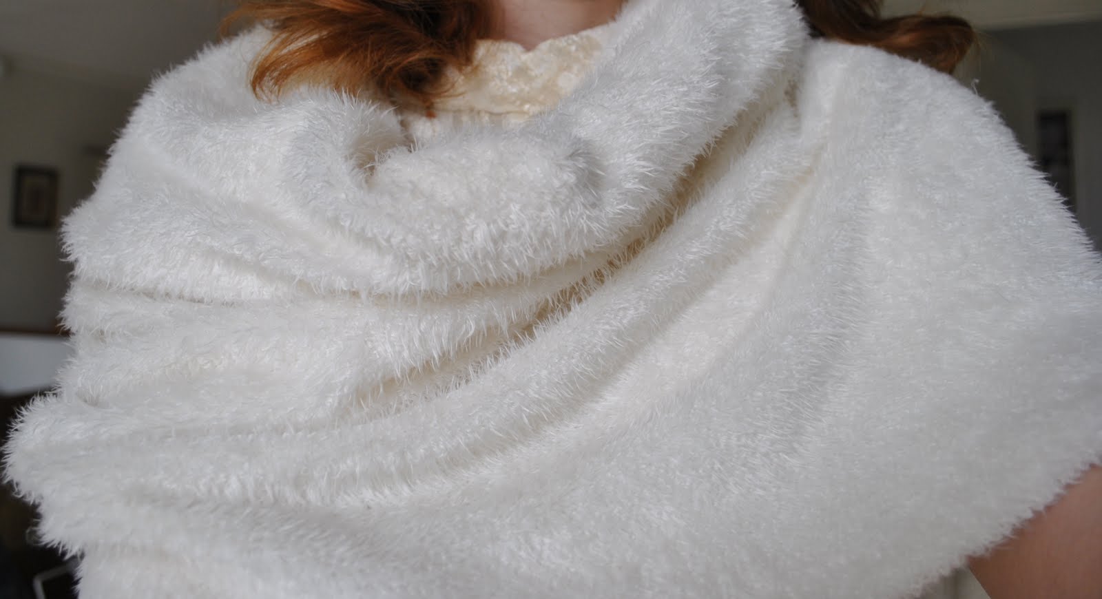 Stole; strip of fluffy stuff, edges narrow zig-zagged