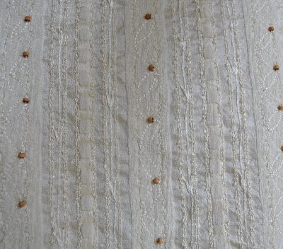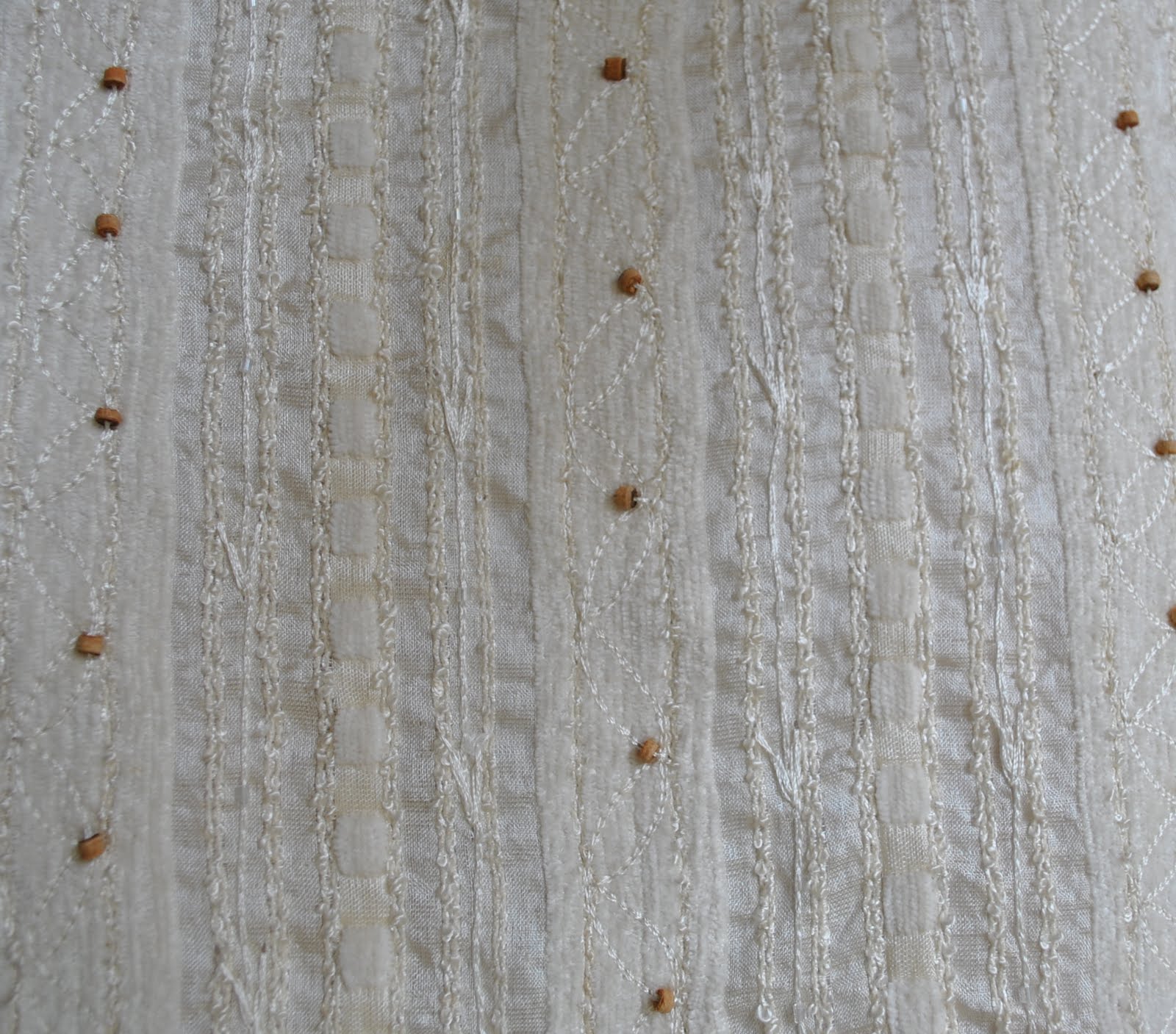 There is actually nothing wrong with this dress. It doesn’t deserve to be a lurker. In fact the fabric is Gorgeous, capital intended. In the close-up below can be seen the detail; sequins, silk embroidery, velvet/chenille ribbon threaded through, tiny cylindrical wooden beading… the design is exquisite. The fabric was a remnant from my favourite shop; Fabulous Fabrics. The problem is in the pattern. I just felt frumpy whenever I put it on. This morning I decided it was the combination of the high collar with the general shapelessness of the dress that made me feel that way, so I did a bit of pinning and refitting and resewed the side seams to make it more form-fitting (Marilyn-esque? even though I hesitate to bring a mental image of such a bombshell to the reader’s mind when my more ordinary silhouette is there for comparison…!) But now I feel far less “mother-of-the-bride”, and will hopefully wear this dress a lot more, like it deserves…