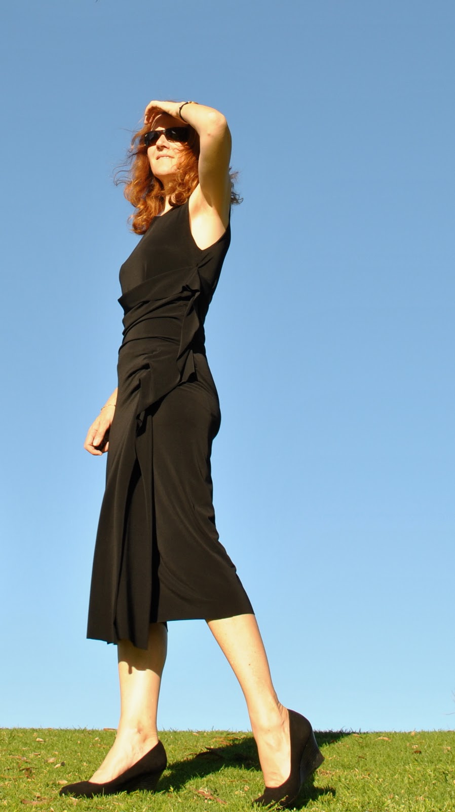 This can be a toughie to wear because of its body-con nature and I have to be mindful not to slouch when I’m wearing it as even the tiniest lump and bump shows to the full… and even though the harsh sun in Australia can be very unflattering in photos (like most Aussies I’ve learnt this the hard way so please be kind if you do care to comment!) I posed in the full sun for this one to show the lovely folding and draping of the design; being a black dress these features wouldn’t show up in a shady photo. The artful folding of the thin silk jersey around the midriff area that becomes a random geometrical frill along the opening edge is my favourite feature of this dress. Come to think of it, the only feature of the dress…! It is a very simple design.