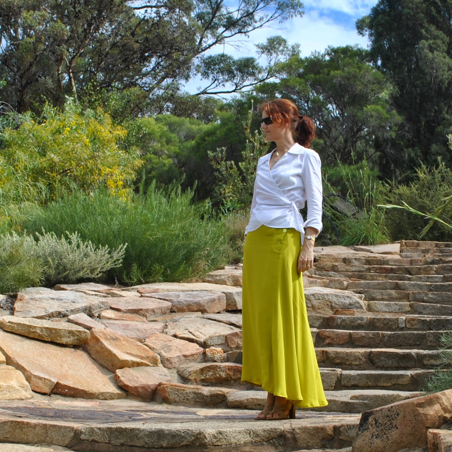 green line: horizontally, at the level where you wish for the top edge of the pocket to hit. The “bagginess” of your pocket is a personal choice; as a guide; my green line is 15cm (6″) in length which coincided with the degree of “flare” of the dress at the hemline.