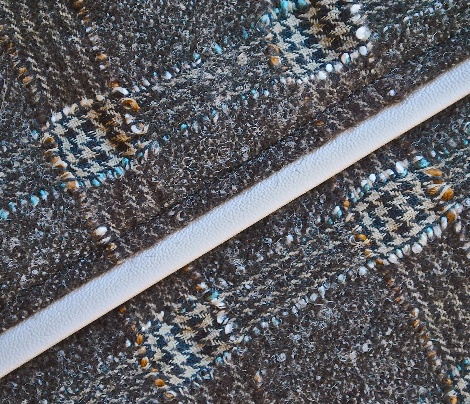 I have made a winter coat for myself! It’s a dark charcoal woollen trench with the seaming and edging accented in pale grey/ivory/bone pleather piping. The charcoal wool has a light gauzy check woven throughout; itself with a teensy houndstooth…